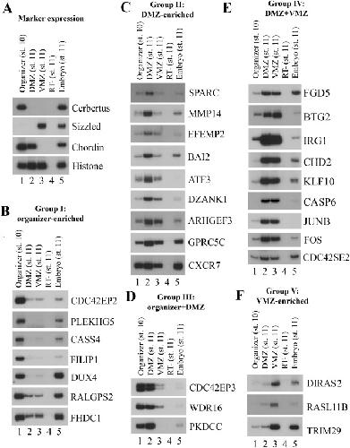 Fig. 2. Differential gene expression in the organizer, the DMZ, and the VMZ. RT-PCR was performed to assay for gene expression in different embryonic regions. A) Marker analysis confirmed the expression of known region-specific genes in the dissected tissues. B) Group I genes were enriched in the organizer. C) Group II genes showed highest expression in the DMZ. D) Group III genes were expressed at high levels in both the organizer and the DMZ. E) Group IV genes were expressed at high levels in both the DMZ and the VMZ. F) Group V genes were enriched in the VMZ.