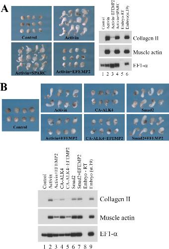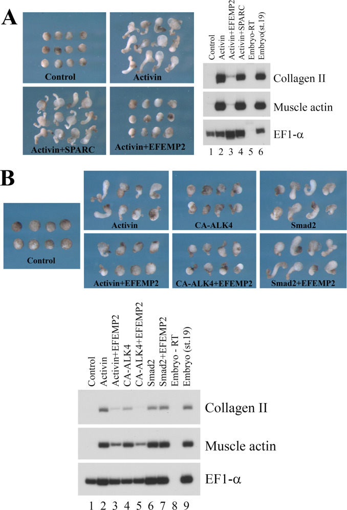 Fig. 4. The ECM protein EFEMP2 inhibits activin signaling downstream of the activated receptor. A) The ECM protein EFEMP2, but not SPARC, inhibited activin-induced mesodermal formation in animal caps. B) EFEMP2 interfered with mesodermal induction by both activin and the activated type I activin receptor ALK4 (CA-ALK4), but did not inhibit mesodermal induction by Smad2 or Smad2-induced animal cap elongation. The doses of RNA used: activin, 2 pg; CA-ALK4, 1 ng; Smad2, 1 ng; EFEMP2, 1 ng.
