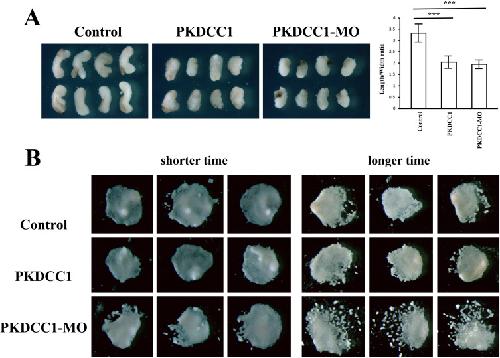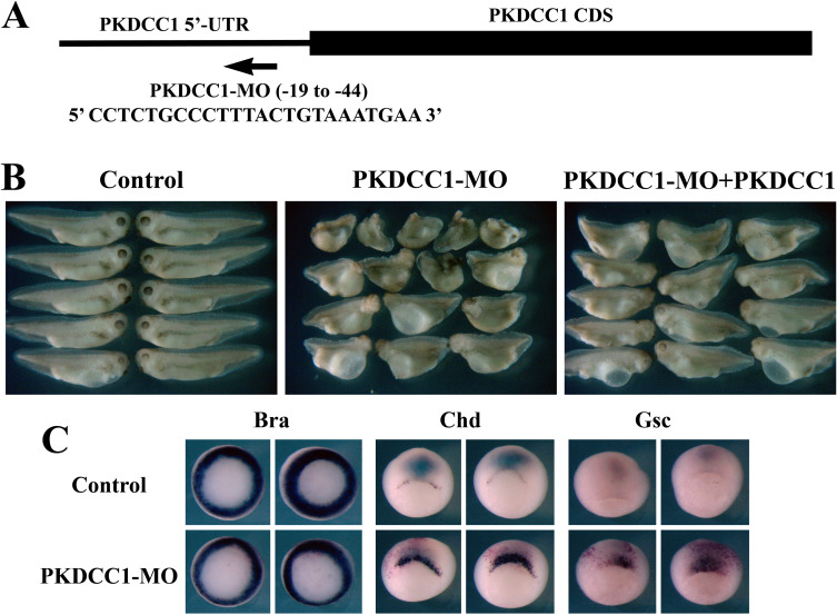 Fig. 6. Knockdown of PKDCC1 resulted in gastrulation defects. A) A translational blocking antisense PKDCC1-MO was designed to hybridize to the 5â²-UTR sequence of the PKDCC transcript. B) Expression of PKDCC1-MO led to embryos with reduced body axis and smaller head, which were greatly rescued by co-expression of low doses of PKDCC1 RNA that did not contain the 5â²-UTR MO-target sequence. C) Knockdown of PKDCC1 resulted in delay in internalization of dorsal mesodermal cells marked by Chd and Gsc.