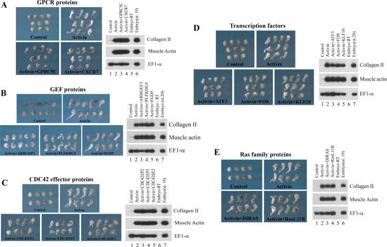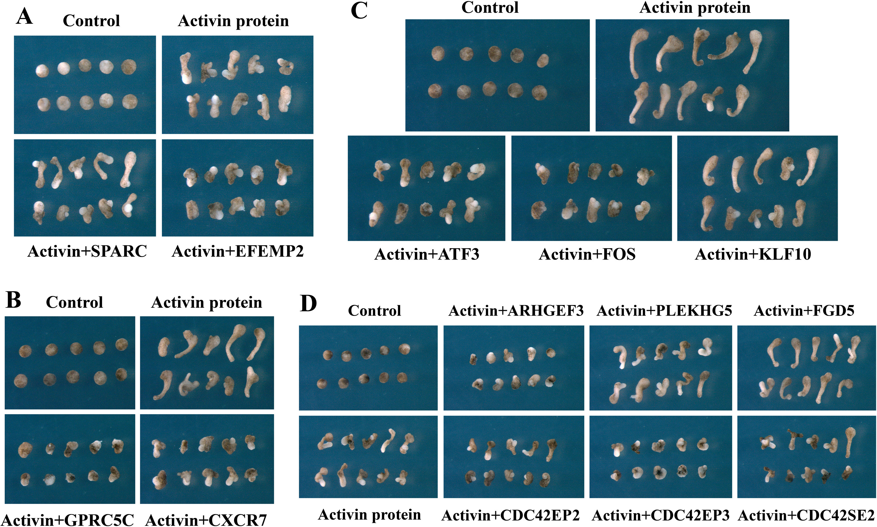 Fig. 3. Distinct activities of the differentially expressed genes to block activin-induced animal cap elongation. RNAs encoding the RNA-seq clones and activin were co-injected into the animal region of 2-cell stage embryos. Animal caps were dissected at blastula stages and cultured to late neurula stages. A) Two GPRC proteins with the highest expression levels in the DMZ, GPRC5C and CXCR7, reduced activin-induced animal cap elongation without interfering with the mesodermal induction by activin. B) The DMZ-enriched GEF, ARHGEF3, efficiently blocked animal cap elongation; but the organizer-enriched GEF, PLEKHG5, or RhoGEF expressed in the DMZ and VMZ, FGD5, could not do so. C) CDC42EP3, which was expressed at high levels in both the organizer and the DMZ, blocked activin-induced animal cap elongation more efficiently than CDC42EP2, a gene enriched in the organizer. D) The transcription factors ATF3 and FOS both reduced the elongation of the animal caps, but KLF10 was ineffective in doing so. E) The ventrally-enriched Ras family proteins, DIRAS and RasL11B, did not block activin-induced animal cap elongation. The doses of RNA used: activin, 2 pg; RNA-seq clones, 0.25â1 ng.