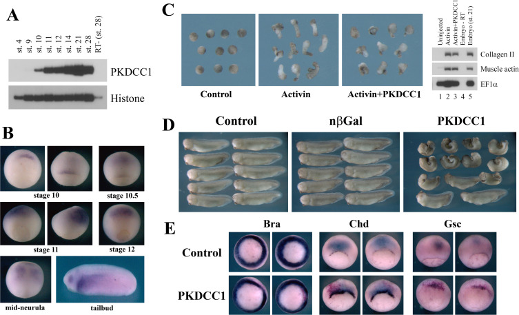 Fig. 5. PKDCC1, a dorsally enriched gene, induced gastrulation defects when ectopically expressed. A) RT-PCR showed that PKDCC1 was first expressed during early gastrulation, and its expression persisted until at least tailbud stages. B) In situ hybridization showed that PKDCC1 was expressed in the organizer at the dorsal lip region in early gastrula embryos. Its expression was then up-regulated in the anterior neural tissues during mid-gastrula to neurula stages. At tailbud stages, PKDCC1 transcripts were seen in the eyes, the lateral plate mesoderm, and the heartprimordium. C) PKDCC1 reduced activin-induced animal cap elongation without affecting mesodermal cell fates. D) Ectopic expression of PKDCC1 in early Xenopus embryos induced gastrulation defects, with the resulting embryos displaying reduced body axis, smaller head, and failure in neural tube closure. E) Overexpression of PKDCC1 did not inhibit mesodermal formation in early embryos, as indicated by normal expression of brachyury (Bra), but delayed involution and/or migration of dorsal mesodermal cells marked by chordin (Chd) and goosecoid (Gsc).
