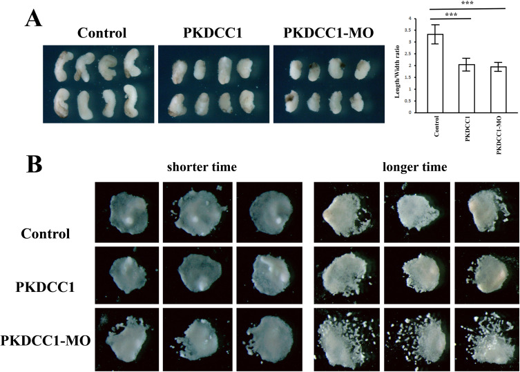 Fig. 7. PKDCC1 regulates gastrulation movements. A) Both ectopic expression and knockdown of PKDCC1 led to reduction of convergent extension of trunk mesodermal tissues derived from the DMZ. The length over width ratio of the explants decreased significantly by enhanced or reduced expression of PKDCC1. B) While altered levels of PKDCC1 did not prevent collective cell sheet migration on fibronectin, prolonged culture of the explants resulted in more pronounced cell dissociation in the absence of PKDCC1, suggesting that PKDCC1 modulated cell cohesion in the anteriormesendoderm.
