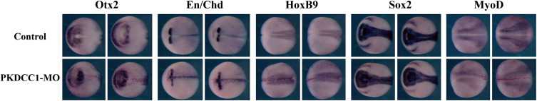 Fig. 8. PKDCC1 regulates anterior neural patterning. Knockdown of PKDCC1 did not change the expression of the axial and the paraxial mesodermal markers Chd and MyoD or the neural marker Sox2, but reduced the expression domain of the forebrain marker Otx2 and shifted the midbrain marker engrailed (En) anteriorly, indicating that PKDCC1 modulated anterior-posterior neural patterning.