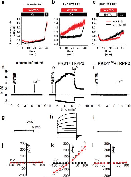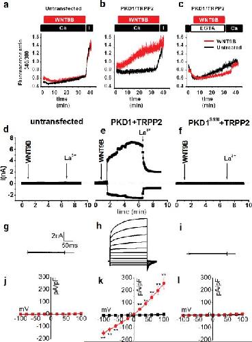 Figure 2. WNT9B activates PKD1/TRPP2Time course of WNT9B-induced Δ[Ca2+]i (shown as fluorescence ratio 340/380) in untransfected (a, red, n=52 cells pooled from 3 independent experiments) or PKD1/TRPP2 co-transfected CHO-K1 cells (b, red, n=30 cells pooled from 5 independent experiments) in 1.8 mM extracellular Ca2+. Ionomycin (I, 2 μM) was added at time point 35 min. (c) Time course of WNT9B-induced Δ[Ca2+]i in PKD1/TRPP2 co-transfected CHO-K1 cells (red, n=65 cells pooled from 5 independent experiments) in Ca2+ free extracellular solution (10 μM EGTA). Δ[Ca2+]i in PBS-treated cells in all three conditions is shown in black. (d-l) Time course (d-f), step currents (g-i), or I-V curves of WNT9B (500 ng/ml)-induced whole cell currents in untransfected (d,g,j), PKD1/TRPP2 co-transfected (e,h,k) or PKD1S99I/TRPP2-co-transfected CHO-K1 cells (f,i,l) in 50 nM intracellular Ca2+ concentration. La3+ (100 μM) was added at the indicated times. I-V curves were taken before (black) and 5 min after (red) the addition of WNT9B in the bath solution of untransfected (j, n=6 cells pooled from 2 independent experiments), PKD1/TRPP2- (k, n=12 cells pooled from 4 independent experiments), or PKD1S99I/TRPP2-co-transfected CHO-K1 cells (l, n=6 cells pooled from 4 independent experiments). Representative time courses (d-f) and step currents (g-i) from 6 (untransfected), 12 (PKD1+TRPP2), or 6 (PKD1S99I+TRPP2) cells. All statistical tests were performed using paired Student's t-test, **P<0.01. Data are shown as mean ± SEM. |