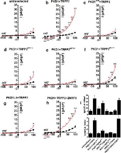 Figure 3. Pathogenic mutations in PKD1 or TRPP2 suppress activation by WNT9B(a-h) I-V curves taken before (black) and 5 min after the addition of WNT9B (500 ng/ml) in the bath solution (red) of untransfected (a, n=5 cells pooled from 2 independent experiments), PKD1/TRPP2- (b, n=8 cells from 3 independent experiments), or PKD1S99I/TRPP2- (c, n=7 cells from 3 independent experiments), PKD1/TRPP2D511V- (d, n=11 from 4 independent experiments), PKD1/TRPP2R872X- (e, n=7 cells from 3 independent experiments), PKD1/TRPP2Kv1.3- (f, n=12 cells from 5 independent transfections), PKD1L1/TRPP2- (g, n=9 cells from 5 independent experiments), or PKD1/TRPP2/ZNRF3- (h, n=11 cells pooled from 3 independent transfections) co-transfected CHO-K1 cells in zero intracellular Ca2+. (i) Summary data of inward (−100 mV) or outward currents (+100 mV) from all groups. Differences between current densities before and after WNT9B for any given membrane potential in I-V curves were determined using paired Student's t-test, *P<0.05, **P<0.01. Data are shown as mean ± SEM. |