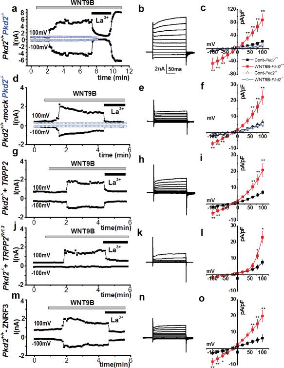 Figure 4. TRPP2 mediates WNT9B-induced whole cell currents in MEFs(a-c) Time course (a), step currents (b), and I-V curves of WNT9B-induced whole cell currents in 50 nM intracellular Ca2+ (c, n=7 cells pooled from 3 independent experiments), before (Cont-Pkd2+/+) or after WNT9B (500 ng/ml, WNT9B-Pkd2+/+) in wild type Pkd2+/+ MEFs. Time course of WNT9B-induced currents in Pkd2−/− MEFs is shown as open blue circles in (a), whereas I-V curves are shown as open black (Cont-Pkd2−/−) and open blue circles (WNT9B-Pkd2−/−) in (c) (n=6 cells from 3 independent experiments). (d-l) Time course, step currents, and I-V curves of WNT9B-induced whole cell currents in zero intracellular Ca2+ in mock- transfected (just CD8α) (d-f, n=6 cells from 3 independent experiments), wild type TRPP2- transfected (g-i, n=12 cells from 5 experiments), or TRPP2Kv1.3- transfected Pkd2−/− cells (j-l, n=5 cells pooled from 3 independent experiments). Time course and I-V curves of WNT9B-induced currents in zero intracellular Ca2+ in Pkd2−/− cells is shown as open blue circles in (d) and (f, n=6 cells pooled from 3 independent experiments). (m-o) Time course, step currents, and I-V curves of WNT9B-induced whole cell currents in zero intracellular Ca2+ in ZNRF3-transfected Pkd2+/+ MEFs (n=12 cells pooled from 4 independent experiments). Step currents are shown 5 min after the addition of WNT9B (500 ng/ml) in the bath solution. I-V curves were taken before (black) and 5 min after the addition of WNT9B (red). Differences between current densities before and after WNT9B for any given membrane potential in I-V curves were determined using paired Student's t-test, *P<0.05, **P<0.01. Data are shown as mean ± SEM. Representative images of time courses (a,d,g,j,m) and step currents (b,e,h,k,n) were obtained from 7, 6, 12, 5, 12 cells, respectively. |