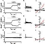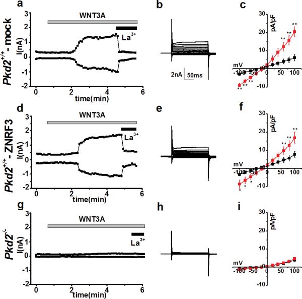 Figure 5. TRPP2 mediates WNT3A-induced whole cell currents in MEFsTime course, step currents, and I-V curves of WNT3A-induced whole cell currents in zero intracellular Ca2+ in mock- (a-c, n=16 cells pooled from 6 independent experiments), or ZNRF3-transfected Pkd2+/+ (d-f, n=20 cells pooled from 7 independent experiments) or Pkd2−/− MEFs (g-i, n=9 cells from 4 independent experiments) before (black) and after the addition of WNT3A (500 ng/ml) in the bath solution (red). Step currents are shown at 5 min after the addition of WNT9B in the bat solution. Statistical analysis was performed using paired Student's t-test, *P<0.05, **P<0.01. Data are shown as mean ± SEM. Representative images of time courses (a,d,g) and step currents (b,e,h) were obtained from 16, 20, 9 cells, respectively. |