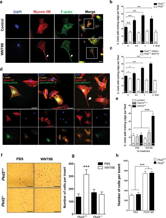 Figure 7. TRPP2 mediates WNT9B-induced cell migration(a) Pkd2+/+ cells stained with phalloidin (green, to visualize F-actin), Myosin IIB (red), or DAPI (blue) at 0 (Control) or 30 min after the addition of WNT9B (500 ng/ml). Arrow heads indicate accumulation of F-actin and Myosin IIB in the trailing edge of a migrating cell. Scale bar, 50 μm. (b) Percentage of Pkd2+/+ cells with trailing edge per field (total number of fields of cells pooled from 3 independent experiments shown in graph) incubated with WNT9B or PBS at different time points. (c) Percentage of cells with trailing edge per field (total number of fields of cells pooled from 3 independent experiments shown in graph) in Pkd2+/+ MEFs incubated with WNT9B in the presence or absence (DMSO) of 10 μM BAPTA/AM at different time points. (d) Representative images of GFP-, GFP+TRPP2WT- or GFP+TRPP2Kv1.3-transfected Pkd2â/â cells stained for F-actin (yellow) and Myosin IIB (red). Scale bar, 50 μm. (e) Percent of migrating GFP-positive cells in three groups treated for 1 h with PBS or WNT9B (500 ng/ml) from one representative out of three independent transfections (total number of fields of cells from a single experiment, that was independently repeated three times are shown in graph). Statistics source data for all three experiments are available in Suppl. Table 3. (f) Cells migrated through a trans-well filter in the presence of WNT9B (1 μg/ml) or PBS for 6 h. Scale bar, 500 μm. (g) Number of migrating Pkd2+/+ or Pkd2â/â cells through a trans-well filter in the presence of PBS or WNT9B. n= 18 fields per group pooled from 3 independent experiments scoring a total of 2462 (Pkd2+/+-PBS), 5665 (Pkd2+/+-WNT9B), 3091 (Pkd2â/â-PBS), or 2796 (Pkd2â/â-WNT9B) cells. (h) Number of migrating cells in the presence of PBS or PDGF-BB (25 ng/ml). Data were pooled from 3 independent experiments in quadruplicates (n= 12 fields per group scoring a total of 3625 (Pkd2+/+-PBS), 8927 (Pkd2+/+-PDGF-BB), 3904 (Pkd2â/â-PBS), or 9048 (Pkd2â/â-PDGF-BB) cells. N.S means non-significant, *P<0.05, ***P<0.001 in one-way ANOVA followed by Neuman-Keuls post hoc test. Data are shown as mean ± SEM. |