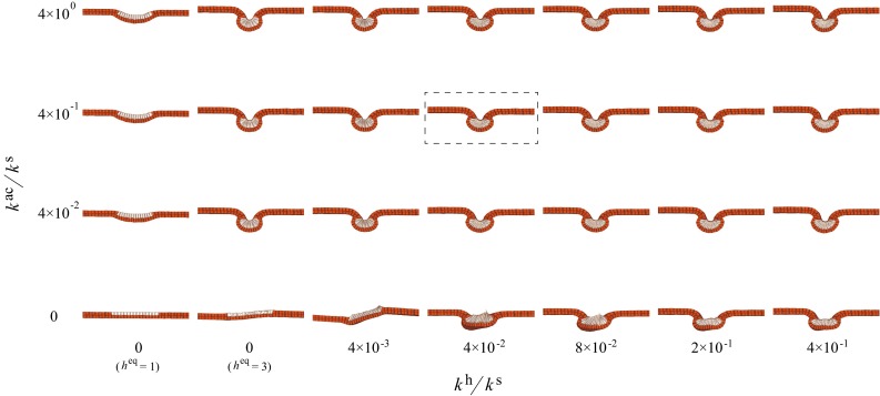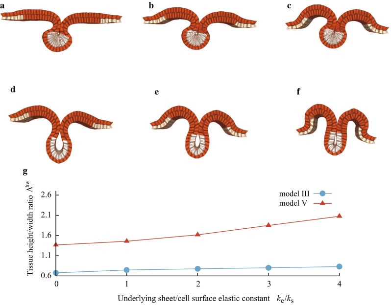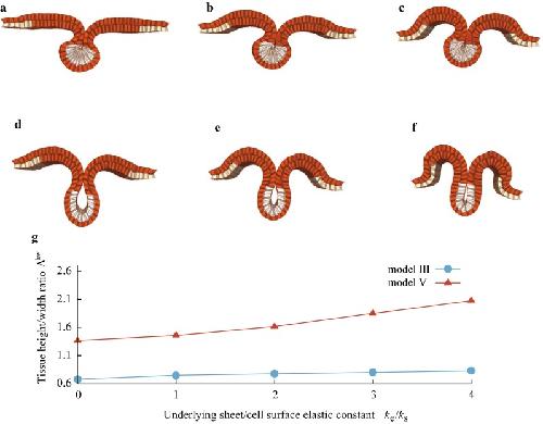 Fig. 5. Effect of the elastic sheet underneath the deep layer on neural tube shapes were examined with and without cell elongation. Simulation results using model III (control) for a