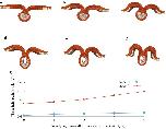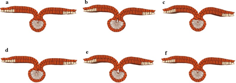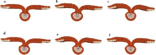Fig. 6. Effect of permutation of onset time of the apical constriction (AC), cell elongation (EL), and cell migration (CM) on the neural tube shape. The order of three events is a AC t= 0.00, 0.25, and 0.49, respectively