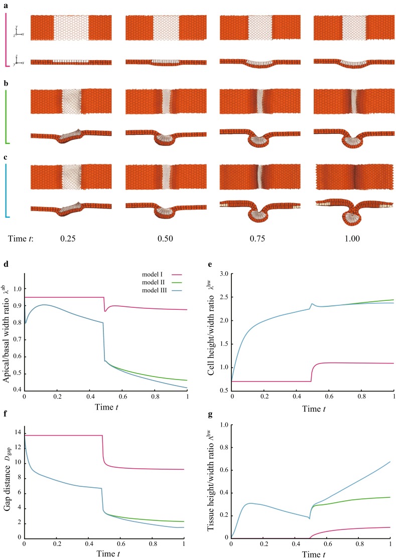 Fig. 2. Different combinations of the physical events during neural tube closure examined using a model I, b model II, and c model III are shown as snapshots over time. The migrating cells are outside of the visualized area except Λhw, as a function of time t