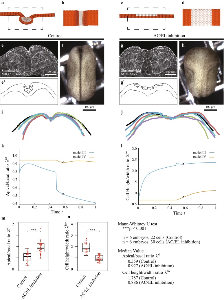 Fig. 3. Shapes of control, and MID1/2 and Shroom3 inhibited (AC/EL inhibition) embryos observed in silico and in vivo. Mediolateral cross-sectional views of the neural tissue shape at time t=0.58, which are compared with the experimental values. m, n The experimental values of those ratios at stage 16