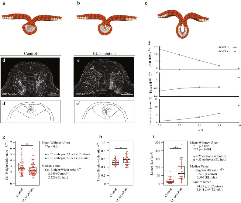 Fig. 4. Shapes of control, and MID1/2 inhibited (EL inhibition) embryos observed in silico and in vivo. The neural tube closure in the simulations using a model III with Λhw, and i the lumen size in experiments