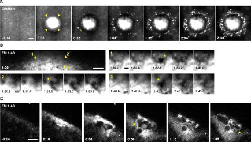 FIGURE 1:. Exocytosis occurs upon wounding. (A) X. laevis oocyte wounded in the presence of extracellular fluorescent dextran (Texas Red dextran). Intrusion of dextran into the cell is initially limited to a region proximal to the wound (arrowheads), but then compartments distal to the wound undergo exocytosis and imbibe dextran (first event indicated by arrow). See Supplemental Movie S1. (B) An oblique view of an oocyte wounded in medium containing FM 1-43. Wound center is out of frame, toward the bottom of the image. Numbered arrowheads indicate sites of exocytosis, highlighted in enlarged insets. See Supplemental Movie S2. (C) Oblique view of an oocyte wounded in the presence of FM 1-43. Arrowheads highlight membranous compartments labeled by FM 1-43 during repair. See Supplemental Movie S3. Times in minutes:seconds, with t = 0:00 corresponding to moment of wounding. Scale bars, 10 μm (A), 5 μm (B, C), 1 μm (B, insets).
