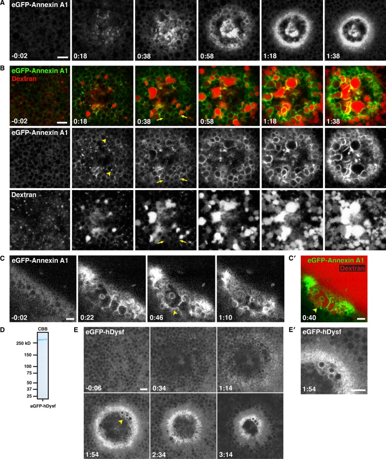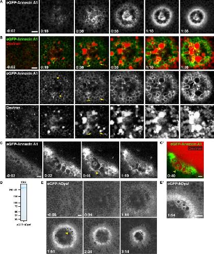 FIGURE 7:. Human annexin A1 and dysferlin are recruited to membranous structures at wounds. (A) Low-magnification, en face view of wounded oocyte expressing eGFP-annexin A1. Annexin is recruited to cortical foci (0:18), vesicles at the wound edge (0:38), and a tight ring around the PM (1:18). See Supplemental Movie S14. (B) En face view of oocyte expressing eGFP-annexin A1 wounded in the presence of fluorescent extracellular dextran (Alexa Fluor 647 dextran). Annexin is recruited to foci (arrowheads) and vesicles before dextran incorporation (arrows). At increasing times postwounding, annexin also labels compartments in the wound interior (1:38). See Supplemental Movie S15. (C) Oblique view of a cell expressing eGFP-annexin A1 wounded in the presence of extracellular fluorescent dextran (not shown), showing eGFP-annexin A1 accumulating at a nascent patch (arrowheads). See Supplemental Movie S16. (C′) Still from C showing that eGFP-annexin A1–labeled compartments (green) fuse to form a barrier that excludes extracellular fluorescent dextran (red; Alexa Fluor 647 dextran) from the cytoplasm. (D) Coomassie-stained SDS–PAGE gel showing recombinant FLAG-eGFP-hDysferlin_isoform 1 purified from Sf9 cells. (E) Oocyte wounded after microinjection with recombinant FLAG-eGFP-hDysferlin. (E′) Enlargement of region indicated by an arrowhead in E, showing recruitment of dysferlin to a tight ring at the PM bordering the wound and to vesicles at wound edge. Time in minutes:seconds, with t = 0:00 corresponding to the moment of wounding. Scale bars, 5 μm.