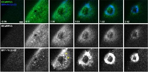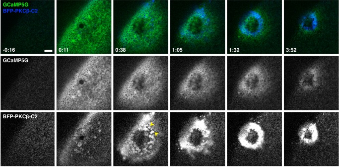 FIGURE 9:. C2 accumulation follows elevation of intracellular calcium. Oblique view of wounded oocyte expressing GCaMP5G and BFP-PKCβ-C2. Increased calcium (detected by GCaMP5G) initially extends far from the site of membrane damage before being confined to a ring around the wound edge at later time points. The pattern of C2 recruitment follows that of calcium elevation, although the GCaMP5G signal is broader and more diffuse, whereas C2 is concentrated on the PM and vesicles (arrowheads). See Supplemental Movie S20. Time in minutes:seconds, with t = 0:00 corresponding to the moment of wounding. Scale bar, 10 μm.