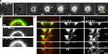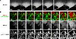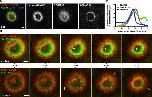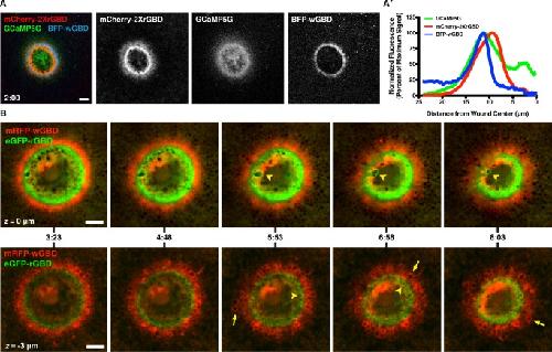 FIGURE 10:. Patterning of elevated calcium, Rho, and Cdc42. (A) Low-magnification, en face view of wounded oocyte expressing BFP-wGBD, mCherry-2XrGBD, and GCaMP5G; the ring of calcium elevation overlaps the Rho and Cdc42 activity zones. See Supplemental Movie S21. (A′) Line scan from A, showing positions of active Rho and Cdc42 with respect to calcium. The increased calcium spans both zones, with peak intensity of the GCaMP5G signal closer to the peak of Cdc42 activity than that of Rho. (B) En face views of wounded oocyte expressing mRFP-wGBD and eGFP-rGBD from two different focal planes. z = 0 μm (top row, Supplemental Movie S22) corresponds to a surface view, whereas z = −3 μm (bottom row, Supplemental Movie S23) represents a subcortical view. Active Rho (arrowheads) and Cdc42 (arrows) are present on compartments other than the PM at wounds. Time in minutes:seconds, with t = 0:00 corresponding to the moment of wounding. Scale bars, 10 μm.