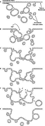 FIGURE 11:. Schematic diagram of membrane dynamics at single-cell wounds. Representative time course of wound-induced membrane dynamics. (A) Resting plasma membrane with proximal intracellular membranous compartments. Double-headed arrows represent incipient membrane fusion events. Upon wounding (B), calcium enters the cell, causing fusion of intracellular vesicles with each other and the PM to form a patching membrane (C). Intracellular compartments continue to fuse with both the patch and the PM distal to the site of damage (D–F). The extracellular face of the patch ruptures outward (E; arrowheads) in a process called “explodosis”; this allows for resolution of a double-membrane structure and formation of a continuous barrier between the cytoplasm and the extracellular environment (F). Membrane fusion and remodeling events occur long after the initial resealing events.
