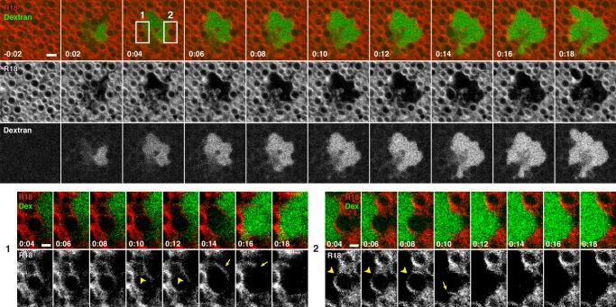 FIGURE 2:. Extracellular dextran has limited access to the cytoplasm of wounded cells. En face view of oocyte prestained with R18 and wounded in the presence of extracellular fluorescent dextran (Oregon Green 488 dextran). Areas highlighted by boxes at t = 0:04 are enlarged to highlight wound dynamics. Enlargement of region 1 (bottom, left) shows fusion of two compartments (arrowheads) before rupture and imbibing of dextran at 0:14–0:16. Arrow shows fragment of compartment after rupture. Enlargement of region 2 (bottom, right) highlights a compartment at the wound edge (arrowheads) that is exposed to dextran upon rupture at 0:10. A fragment of the vesicle is visible after rupture (arrow). See Supplemental Movie S4. Times in minutes:seconds, with t = 0:00 corresponding to moment of wounding. Scale bars, 5 μm (top), 2.5 μm (bottom).