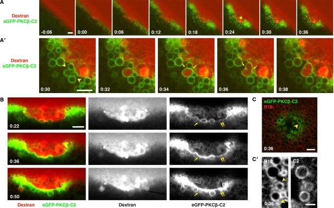 FIGURE 4:. The C2 domain of PKCβ labels intracellular vesicles and wound patch. (A) Oblique, low-magnification view of oocyte expressing eGFP-PKCβ-C2 wounded in the presence of extracellular fluorescent dextran (Texas Red dextran). eGFP-PKCβ-C2 is rapidly recruited to the wound and labels vesicles clustered around its edge. A brightly stained structure (asterisk) of unknown identity appears in the wound pit. See Supplemental Movie S6. (A′) Enlargement of A starting at t = 0:30, showing tightly packed, C2-labeled vesicles at the wound edge (arrows) closely opposed to a nascent patch (green line bordering wound). A large vesicle fuses with the patch and imbibes dextran (0:32) and then fuses with another vesicle (0:36). (B) Cell expressing eGFP-PKCβ-C2 wounded in the presence of extracellular fluorescent dextran (Texas Red dextran). Single arrowheads denote membranous compartments incorporated into the patch; double arrowheads denote a region of the patch that progressively accumulates C2. See Supplemental Movie S7. (C) Oocyte expressing eGFP-PKCβ-C2 and stained with R18 before wounding. The vesicular structures labeled by the C2 probe upon wounding are also labeled by R18 (arrowhead). (C′) Enlargement of C showing that the C2 probe labels most, but not all, compartments labeled by R18 (R18-labeled vesicles free of C2 signal are denoted by the arrowheads). Times in minutes:seconds, with t = 0:00 corresponding to moment of wounding. Scale bars, 5 μm (A, A′, B, C), 2.5 μm (C′).