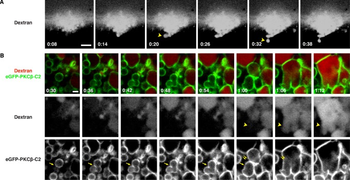 FIGURE 5:. Vesicle–vesicle fusion continues through wound repair. (A) Oblique view of oocyte wounded in the presence of extracellular fluorescent dextran (Texas Red dextran) reveals compound exocytosis occurs at the wound edge (i.e., the site of patch formation). Compound exocytotic events are indicated by arrowheads. See Supplemental Movie S8. (B) Oblique, high-magnification view of the edge of a wound in an oocyte expressing eGFP-PKCβ-C2 wounded in the presence of extracellular fluorescent dextran (Alexa Fluor 647 dextran, pseudocolored red). Small, tightly packed vesicles near the wound edge (arrow) acquire C2, fuse with each other (0:48–0:54), and then fuse with another large compartment (double arrows), thereby acquiring dextran (arrowheads). See Supplemental Movie S9. Time in minutes:seconds, with t = 0:00 corresponding to the moment of wounding. Scale bars, 5 μm (A), 2 μm (B).