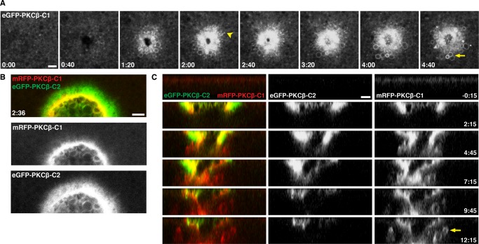 FIGURE 8:. Wound-induced lipid domains persist throughout membrane repair. (A) En face view of wounded eGFP-PKCβ-C1–expressing oocyte. C1 labels both small (arrowhead at t = 2:00) and large (arrow at t = 4:40) membrane structures upon wounding. See Supplemental Movie S17. (B) Cells expressing mRFP-PKCβ-C1 and eGFP-PKCβ-C2 reveal lipid patterning around wounds. C1 accumulates at the leading edge of wounds, whereas C2 is more broadly distributed. See Supplemental Movie S18. (C) A z-view of membrane dynamics after wounding, as seen with mRFP-PKCβ-C1 and eGFP-PKCβ-C2. Remodeling of wound area and patch continues long after the initial membrane disruption and loss of C2, with C1 evident on the presumptive patch, as well as in vesicles surrounding the patch (arrow). See Supplemental Movie S19. Time in minutes:seconds, with t = 0:00 corresponding to the moment of wounding. Scale bar, 5 μm.