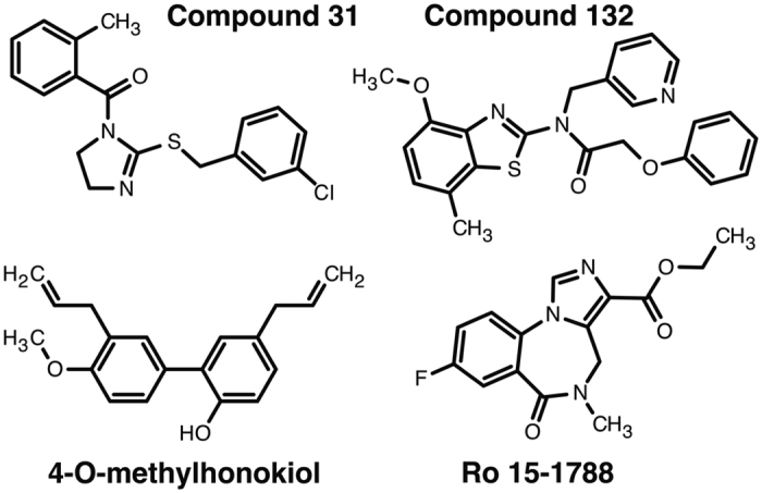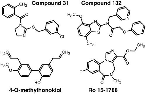 Figure 1. Chemical structure of compounds 31, 132, 4-O-methylhonokiol, and the high-affinity benzodiazepine antagonist Ro 15-1788.