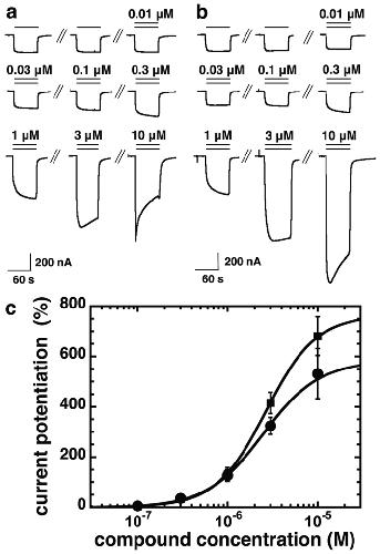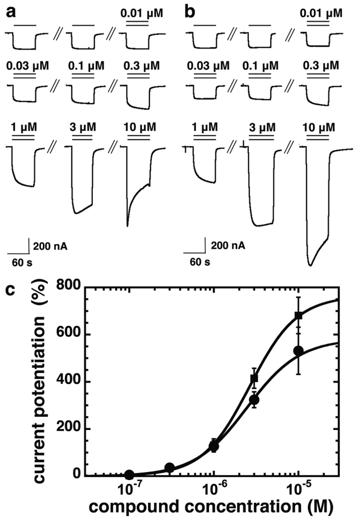 Figure 2. Compounds 31 and 132 stimulate GABA currents mediated by α1β2γ2 receptors in a concentration-dependent manner.α1β2γ2 receptors were expressed in Xenopus oocytes and electrophysiological experiments were performed. Original current traces of an experiment with compound 31 (a) and with compound 132 (b). Numbers indicate applied concentrations of the respective compounds. (c) Concentration dependence of the positive allosteric modulation by compound 31 (closed circles) and compound 132 (closed squares) in oocytes expressing α1β2γ2 receptors. Mean data ± SD for both compounds is shown, n = 3.