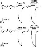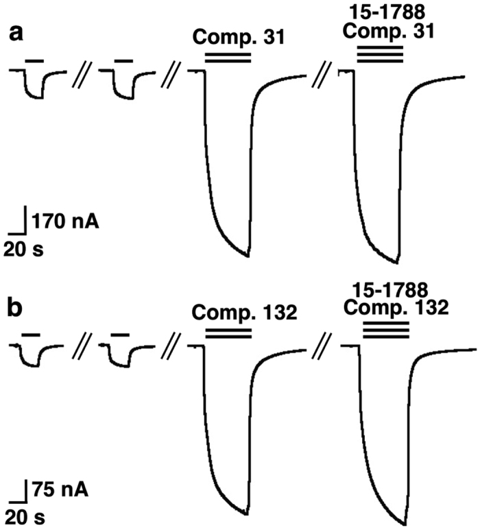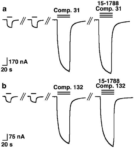 Figure 3. Compounds 31 and 132 do not act at the classical high affinity site for benzodiazepines.GABA at a concentration eliciting 0.5% of the maximal current amplitude (EC0.5, single bars) was applied until a stable response was obtained. Subsequently, the same concentration of GABA was co-applied with 3 μM of compounds 31 (a) or 132 (b), which resulted both in a large increase of current amplitude. Co-application of Ro 15-1788 with compound and GABA did not reduce the degree of modulation in both cases. Experiments were repeated 4 times, with three different batches of oocytes, with a similar outcome.