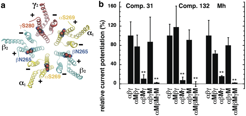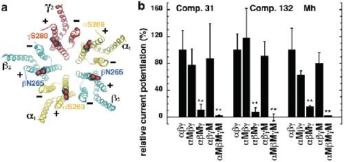 Figure 4. (a) Model structure of the GABAA receptor transmembrane domain. The major isoform of the GABAA receptor is composed of two α1, two β2, and one γ2 subunits. The model structure depicts the crystalized homomeric β3 GABAA receptor (PDB structure 4COF)38. In this figure, some of the β3 subunits were renamed α1 (yellow), β2 (blue) and γ2 (red); structures are shown in ribbon representation. The mutated residues α1S269, β2N265, and γ2S280 are located at the interfaces between subunits. (b) Potentiation of the GABA response by compound 31 (3 μM), compound 132 (3 μM), and 4-O-methylhonokiol (1 μM, abbreviated Mh) in wild-type α1β2γ2, single mutant (α1M, β2M, γ2M), and triple mutant receptors expressed in Xenopus oocytes. The bars indicate mean ± SD, n = 3.