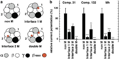 Figure 5. Individual roles of the two β+/α− interfaces in channel modulation by compounds 31, 132 and 4-O-methylhonokiol.(a) Scheme showing the four concatenated wild-type and mutant receptors. 1 and 2 refer to the two different β+/α− subunit interfaces, interface 1 and interface 2. The location of the β2N265I mutations is indicated in red color. Concatenated receptors were prepared containing no mutation (α1-β2-α1/γ2-β2, non M), a mutation at interface 1 (α1-β2-α1/γ2-β2M, interface 1 M), a mutation at interface 2 (α1-β2M-α1/γ2-β2, interface 2 M), or mutations in both sites (α1-β2M-α1/γ2-β2M, double M). Interface 2 harbors a binding site for GABA with higher apparent affinity for channel gating than the one positioned at the interface 154. (b) Potentiation by compound 31 (3 μM), compound 132 (3 μM), and 4-O-methylhonokiol (1 μM), using an EC0.5–1.5 concentration of GABA for each concatenated receptor subtype. Bars indicate mean ± SD, n = 3.