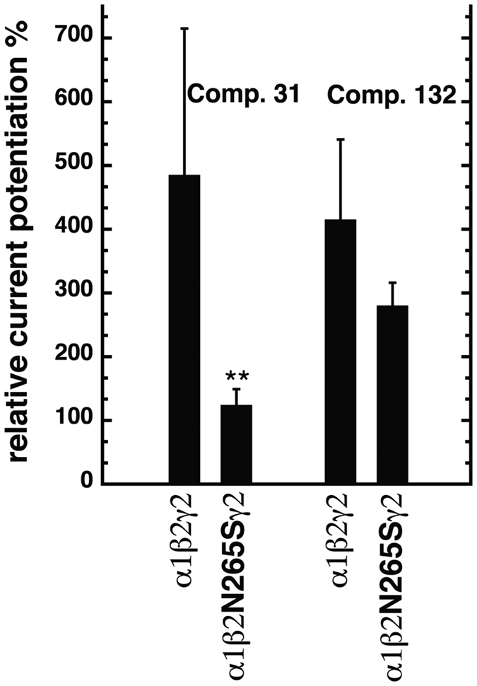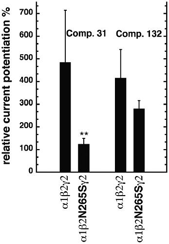 Figure 6. Effect of the β2N265S mutation on modulation by compounds 31 and 132.Wild-type α1β2γ2 and mutated α1β2N265Sγ2 receptors were expressed in Xenopus oocytes and studied. Potentiation of GABA currents was determined using 3 μM of compound 31 or 132. Bars indicate mean ± SD, n = 4–11.