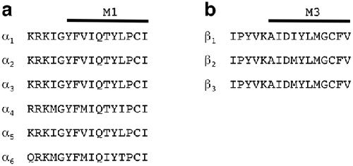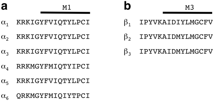 Figure 8. Alignment of the rat amino acid residue sequences of different α (a) and β (b) subunit isoforms.(a) Sequences preceding M1 and the first part of M1 in α subunits are shown. (b) Sequences preceding M3 and the first part of M3 in β subunits are shown.