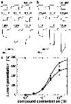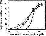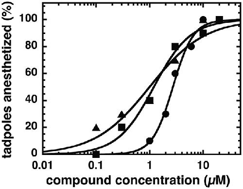 Figure 9. Concentration-response curves for loss of righting reflexes (LORR) in tadpoles for compounds 31 (closed circle), 132 (closed square), and 4-O-methylhonokiol (closed triangle).The percent of animals anesthetized is plotted against aqueous anesthetic concentration, overlaid with logistic fits. Each point represents data from ten animals. Data were fitted to a Hill equation.
