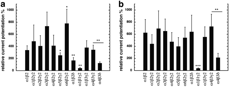 Figure 7. Subunit specificity of current potentiation in different GABAA receptors.Different subunit combinations were expressed in Xenopus oocytes. Potentiation of GABA currents at a GABA concentration eliciting 0.5–1.5% of the maximal current amplitude was determined using 3 μM of compound 31 (a) or 132 (b). Bars indicate mean ± SD, n = 4–11.