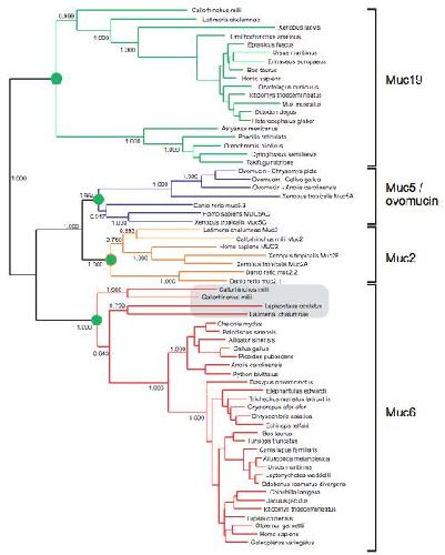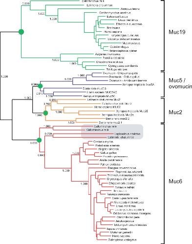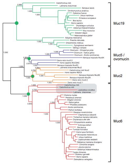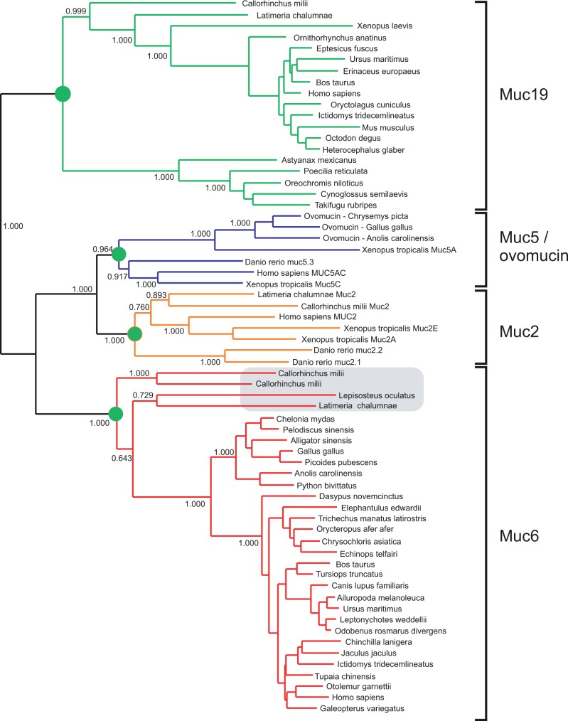 Fig. 2. The mucin Muc6 was present early in vertebrate evolution. Tree was constructed with MrBayes using an alignment of the N-terminal parts of mucins that include the three VWD–C8–TIL units. Homologs of Muc19, Muc6, Muc5, ovomucin, and Muc2 are shown. Critical nodes are labeled with green circles. The four Muc6 homologs of C. milii, L. chalumnae, and Le. oculatus clearly belong to the group of Muc6.