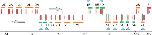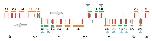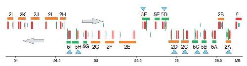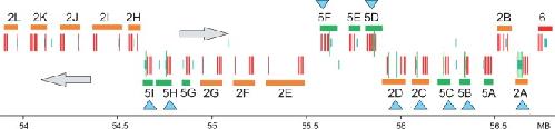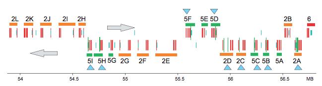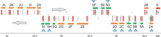 Fig. 3. Genomic organization of X. tropicalis mucins. Genomic region from assembly version 7, accession KB021653.1, region 53,600,000–57,000,000 is shown. Genes are shown for Muc5 paralogs (green) and Muc2 paralogs (orange). Naming of genes was based on their location from right to left. Location of VWD domains, PTS domains, and CysD domains (red, blue, and green vertical bars, respectively) are based on the analysis of the genomic sequence with genewise and an in-house Perl script. Genes where a CysD domain is predicted are indicated with cyan triangles.