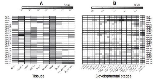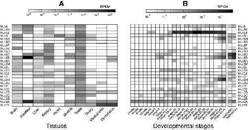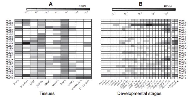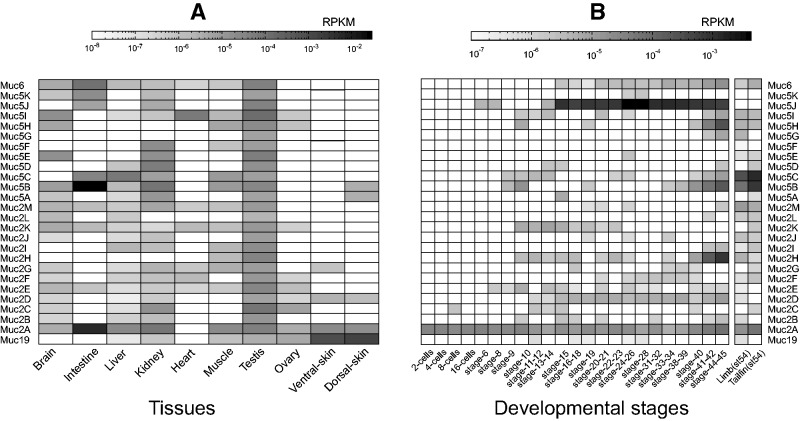 Fig. 4. X. tropicalis mucin gene transcription. A total of 26 different mucin genes were analyzed with respect to gene expression. Expression levels (RPKM) were estimated from public RNA-Seq data as listed in supplementary dataset S2, Supplementary Material online, and as described in more detail in Materials and Methods section. (A) Expression in different tissues. (B) Expression at different developmental stages.