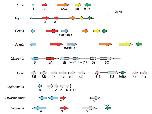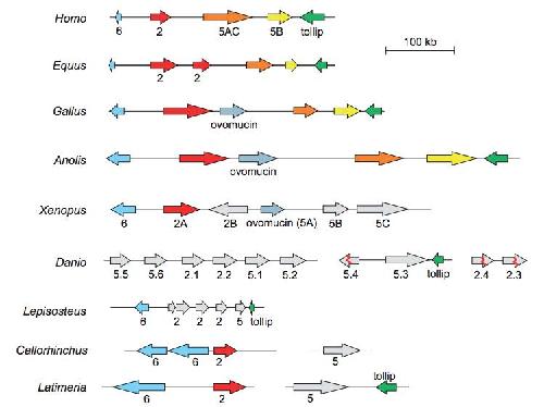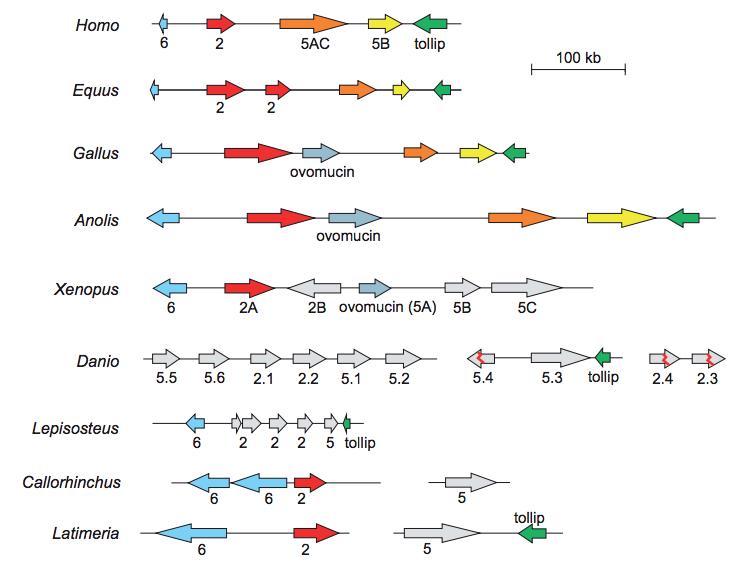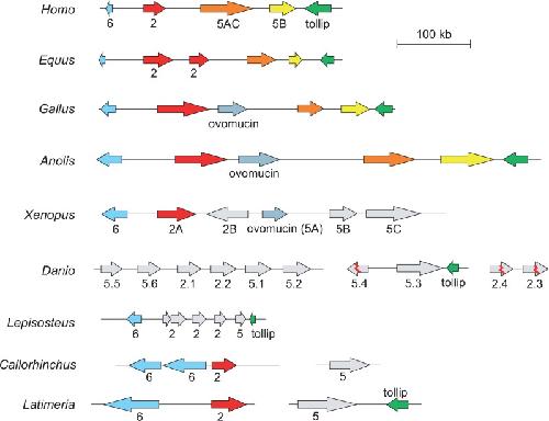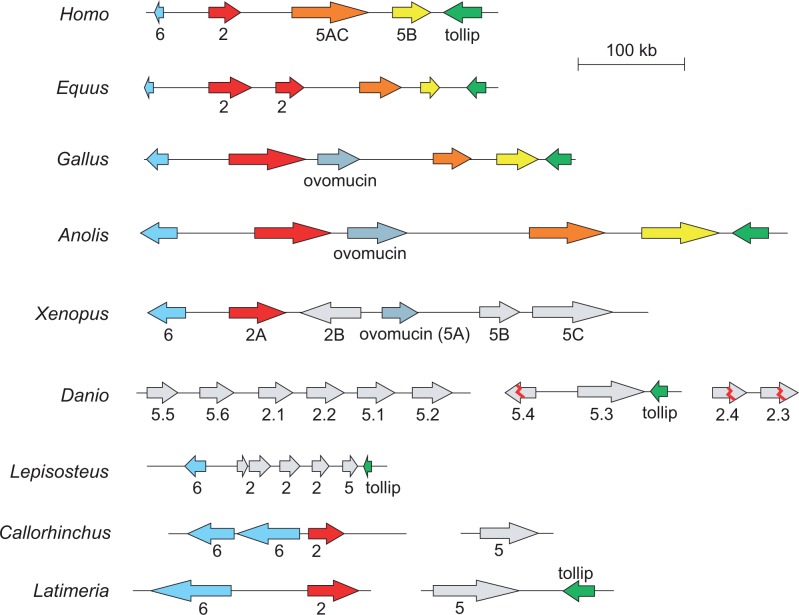 Fig. 5. A conserved structure of mucin genes in vertebrates. Arrows reflect the strand polarity. In the case of X. tropicalis only a part of a larger cluster of mucin genes is shown (see also fig. 3).