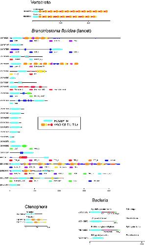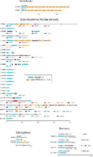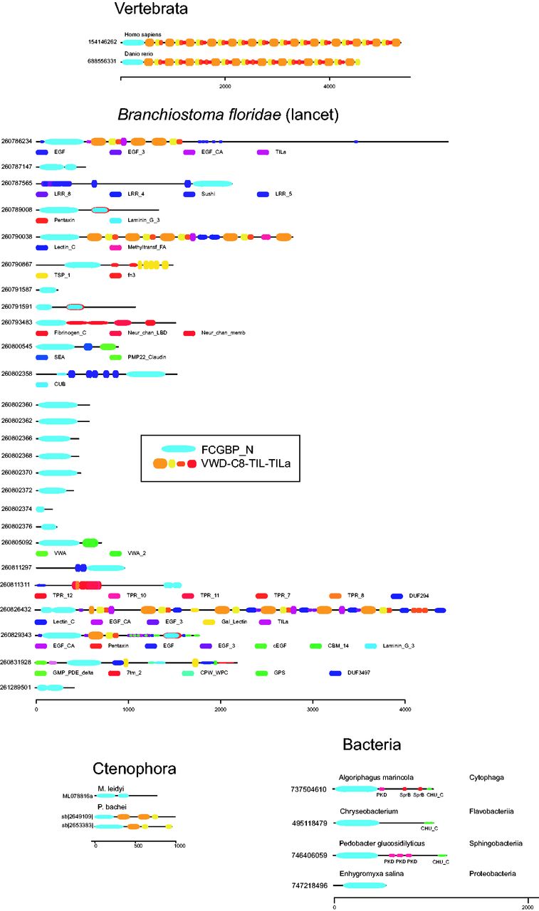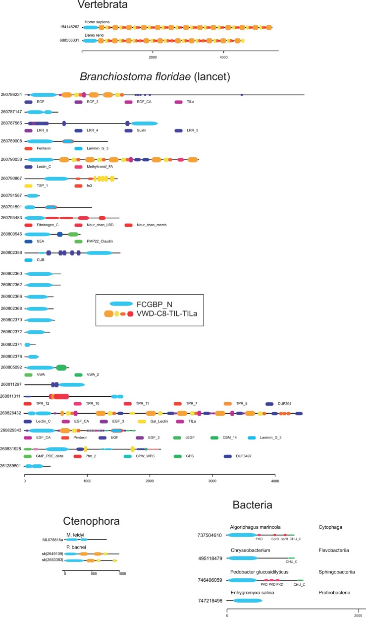 Fig. 7. Domain structures of selected proteins with a domain characteristic of FCGBP. In vertebrates, FCGBP proteins have a large number of VWD–C8–TIL units, in addition to the FCGBP_N domain. In the invertebrate B. floridae, there is a large number of proteins with the FCGBP_N domain. All domains that are not FCGBP_N, VWD, C8, TIL, TILa, or PTS domains are explained below each representation of protein domain architecture. For a complete collection of all proteins with the FCGBP domain, see supplementary figure S5, Supplementary Material online.