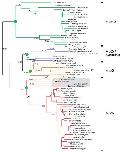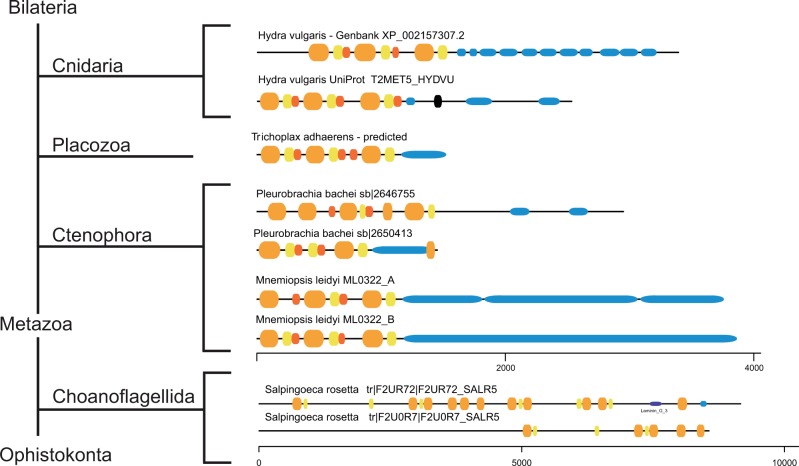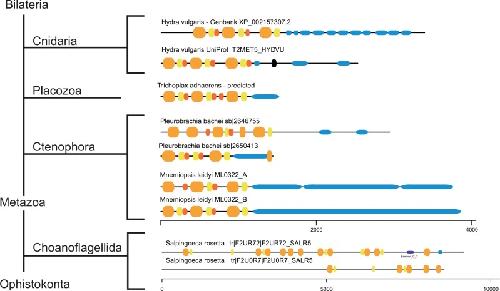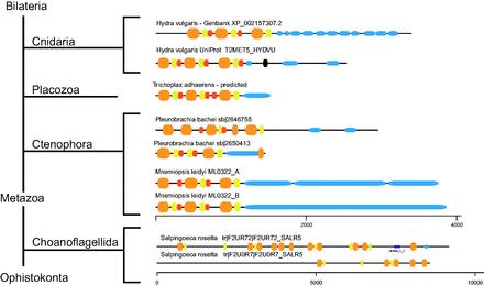 Fig. 6. Gel-forming mucins evolved early during metazoan evolution. Phylogenetic distribution of proteins in selected basal Metazoa with a domain structure characteristic of gel-forming mucins. VWD, C8, TIL, and PTS domains are shown in orange, yellow, red, and blue, respectively.