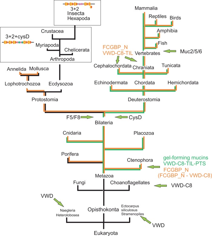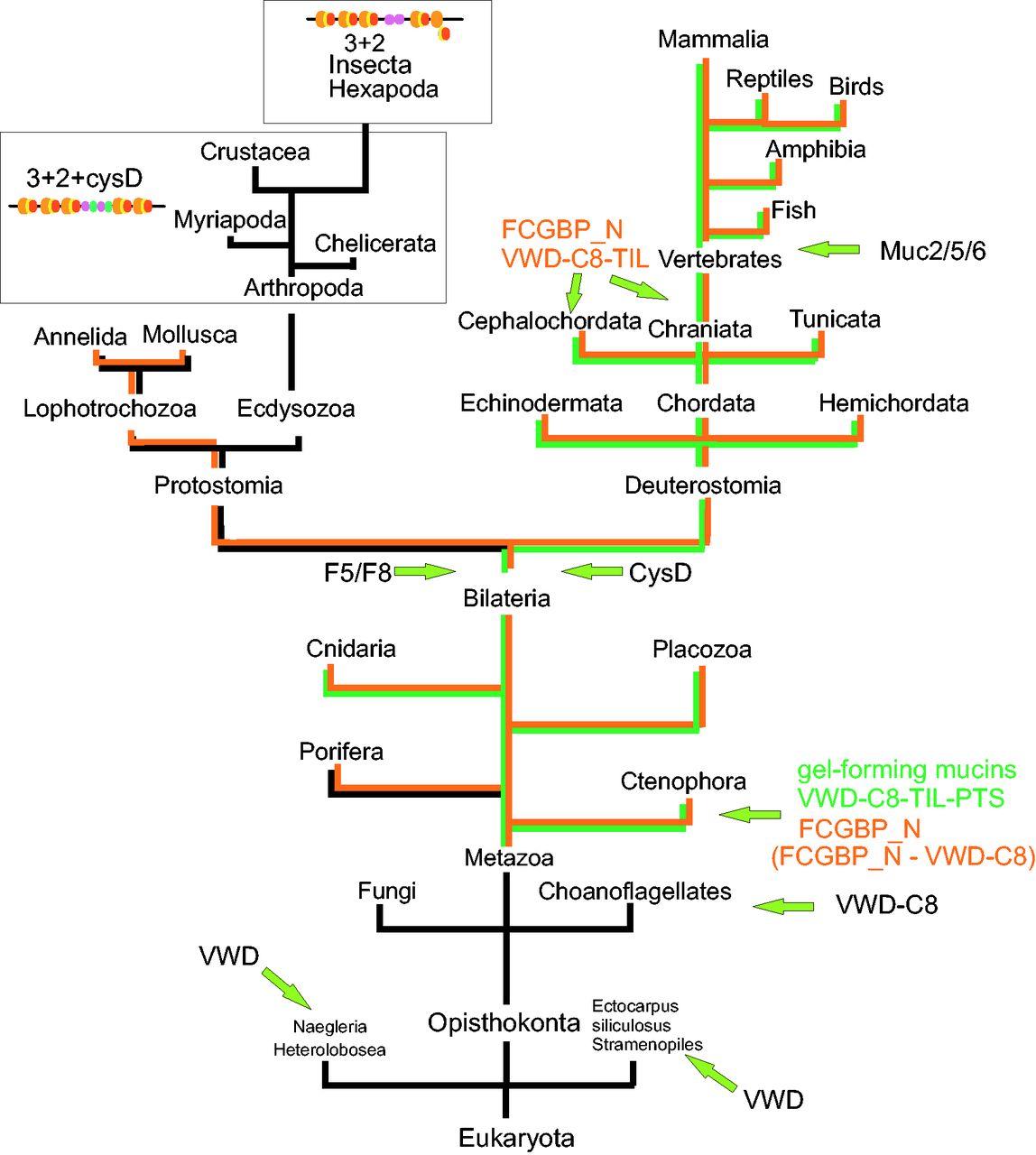 FIG. 8 Summary of mucin and FCGBP protein evolution. The VWD domain seems to occur in a restricted number of protists, but not in combination with the C8 or TIL domains. The combination of VWD/C8 appears in choanoflagellates and the structure characteristic of gel-forming mucins as well as the FCGBP_N-containing proteins appear in Ctenophora. The F5_F8 and CysD domains occur in Bilateria. A protein with FCGBP_N and multiple VWD–C8–TIL domains appears later in evolution as it is observed only in cephalochordates and vertebrates.