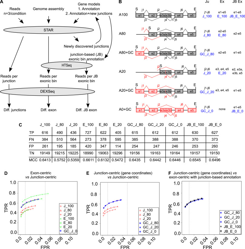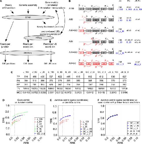 Fig. 1. Comparison of exon-centric and junction-centric approaches with simulated data. A, Overview of the analysis protocols for the RNAseq data. Starting from 6 RNAseq datasets (2 triplicates), we used the mapper STAR in two successive passes to obtain the numbers of reads per junction for each sample. We also used the sequencing data to reconstruct gene models and generate junction-based (JB) exonic regions annotation. We next used HTSeq to count the number of reads in each exonic region (solely based on the preexisting annotation of using the novel JB annotation). We analysed statistically the data with DEXSeq to identify differential junctions, differential exons, and differential JB exons. B, Cartoon illustrating the impact of degrading the annotation on the identification of exons and junctions of a hypothetical gene. A100 corresponds to the perfect annotation and A80, A20 and A0 to a situation where 80%, 20% and 0% of the annotated exons, respectively, are retained. With GC, the correct gene coordinates (start S and end E) are provided in the analysis irrespective of the degree of exonic annotation degradation. The exons and junctions present in the preexisting annotation are in black and those inferred from the sequencing data are in red. C, Number of TP, FN, FP and TN, and Matthews correlation coefficient (MCC) in the situations shown in blue in B, with an adjusted p-value threshold set at 0.05. DâF. ROC curves obtained by plotting the true positive rate [TP/(TP+FN)] against the false positive rate [FP/(FP+TN)] for different p-value thresholds (0.001, 0.01, 0.05, 0.10, 0.15, 0.20).
