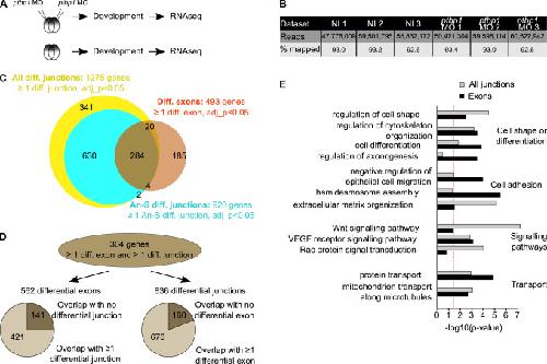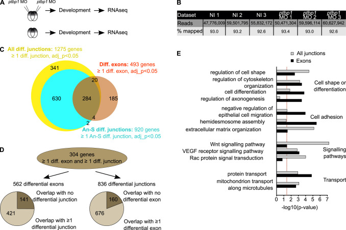 Fig. 2. Comparison of the exon-centric and junction-centric approaches to identify differential splicing patterns in Xenopus laevis. A, RNAseq was carried out from 3 independent pools of stage 28 embryos injected with the morpholino against ptbp1 mRNA (ptbp1 MO), or left uninjected. B, Table summarizing RNAseq data. â% mappedâ is to the percentage of read pairs uniquely mapped to the Xenopus genome (v9.1). C, Venn diagram showing the overlap of the genes with at least one differential exon, the genes with at least one annotation-supported differential junction, and the genes with at least one differential junction. D, For the 304 (284+20) genes with at least one differential exon and one differential junction, we indicate the numbers of differential exons and junctions. The pie charts show the percentage of differential exons associated with one differential junction (left), and the percentage of differential junctions associated with one differential exon (right). E, Comparison of enriched GO terms in differentially spliced genes identified by the junction-centric and the exon-centric approaches. The dotted red line indicates p=0.05. The GO terms are on the left, and we clustered the enriched GO terms in 4 main classes (right).