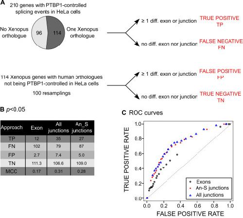 Fig. 3. Assessment of exon-centric and junction-centric performances. A, Pie chart showing the number of identified Xenopus orthologues of human genes with splicing events controlled by PTBP1 (Llorian et al., 2010). We classified the 114 Xenopus genes as True Positive (TP) when at least one (Llorian et al., 2010). We classified the 114 Xenopus genes as True Positive (TP) when at least one differential exon or junction was identified in our experiments, and as False Negative (FN) when no differential exon or junction was identified. Conversely, we sampled 100 times 114 Xenopus genes the human orthologues of which are not regulated by PTBP1, and we classified them as False Positive (FP) when we retrieved them in our experiments, and as True Negative (TN) otherwise. The numbers of FP and TN in the following panels are means of the repeated samplings. B, Number of TP, FN, FP and TN, and Matthews correlation coefficient (MCC) in the exon-centric, the annotation-supported junctions approach, and the all junctions approach, with an adjusted p-value threshold set at 0.05. C, ROC curves for different p-value thresholds (0.05 steps).