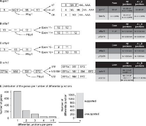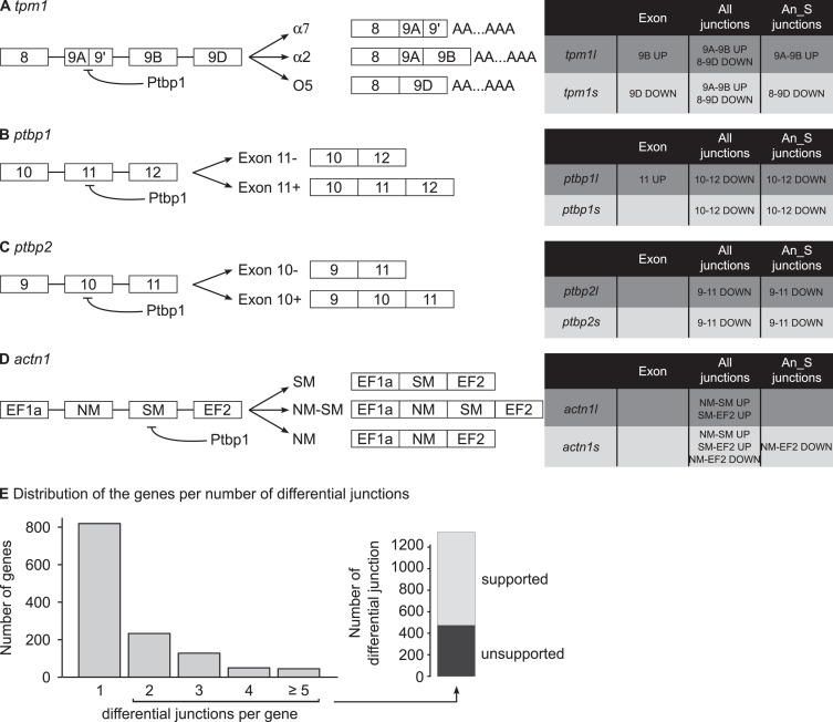 Fig. 5. Analysis of genes known to be regulated by Ptbp1 in Xenopus. A, tpm1 ( Hamon et al., 2004), B, ptbp1 ( Méreau et al., 2015), C, ptbp2 ( Méreau et al., 2015), D, actn1 ( Le Sommer et al., 2005). Left, for each gene, the Ptbp1-repressed exon and the genomic region encompassing it, as well as the different RNA processing patterns, are diagrammed. Introns are represented as horizontal lines and exons as boxes. Right, tables summarizing the exons and junctions identified as differential in ptbp1 morphants by either of the three approaches. Due to Xenopus laevis tetraploidization, each gene is present as two pseudo-alleles indicated âlâ and âsâ. E, Number of genes with the indicated numbers of differential junctions retrieved by the all-junction approach (left part). Number of differential junctions, among the genes harboring at least 2 differential junctions, supported or not by another differential junction (right part).