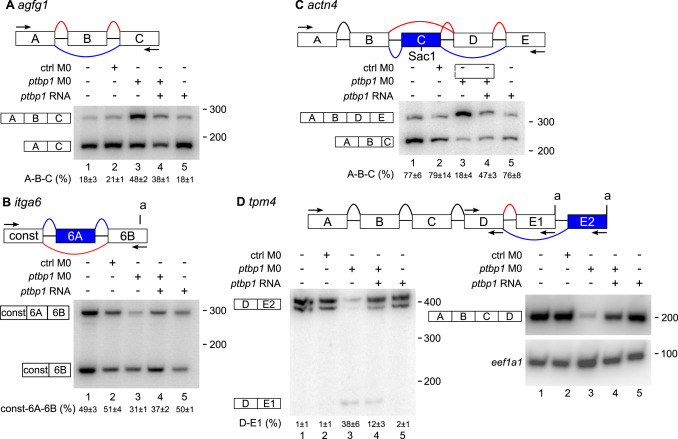 Fig. 6. Confirmation of newly discovered Ptbp1-controlled splicing events. A, agfg1, B, itga6, C, actn4, D, tpm4. Upper panels, genomic region encompassing the Ptbp1-regulated exons. Introns are represented as horizontal lines and exons as boxes. The exons are given arbitrary names, and their genomic coordinates are given in Table ST6. âaâ stands for polyadenylation signal. The splice junctions are positioned along the gene structure. The junctions shown in black were not detected as differently used in control embryos and ptbp1 morphants, while the junctions shown in red and blue were detected as significantly (adjusted p<0.05) increased and decreased, respectively, in ptbp1 morphants. The exons in blue were detected as significantly (adjusted p<0.05) decreased in ptbp1 morphants. Lower panels, autoradiograms of representative RT-PCR experiments carried out with RNAs extracted from stage 28 embryos previously injected with the indicated molecules, and using the primers indicated by arrows in the upper panels. In all the experiments, the primers are designed to amplify both pseudo-alleles, and the forward primer is radiolabeled (*). The quantifications below the gels are means±s.d. of 3 independent experiments. A, agfg1 pre-mRNA contains a cassette exon (B), and its splicing was analysed with primers in flanking exons A and C. B, itga6 pre-mRNA contains a cassette exon (6A), and its splicing was analysed with primers in the constitutive flanking exons âconstâ and 6B. C, actn4 pre-mRNA contains a set of mutually exclusive exons (C and D), and its splicing was analysed with primers in flanking exons A and E, with Sac1 digestion before gel loading. D, tpm4 pre-mRNA contains two alternative terminal exons (E1 and E2), and its splicing was analysed with one forward primer in exons D and reverse primers in exons E1 and E2. Exons E2 of tpm4l and tpm4s differ by an indel located in the 3â²UTR, explaining that the D-E2 amplimere is a doublet. The total amount of tpm4 mRNA was appraised from RT-PCR with primers in exons A and D, and eef1a1 (EF1α) confirmed similar RNA extractions.