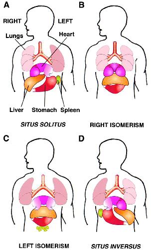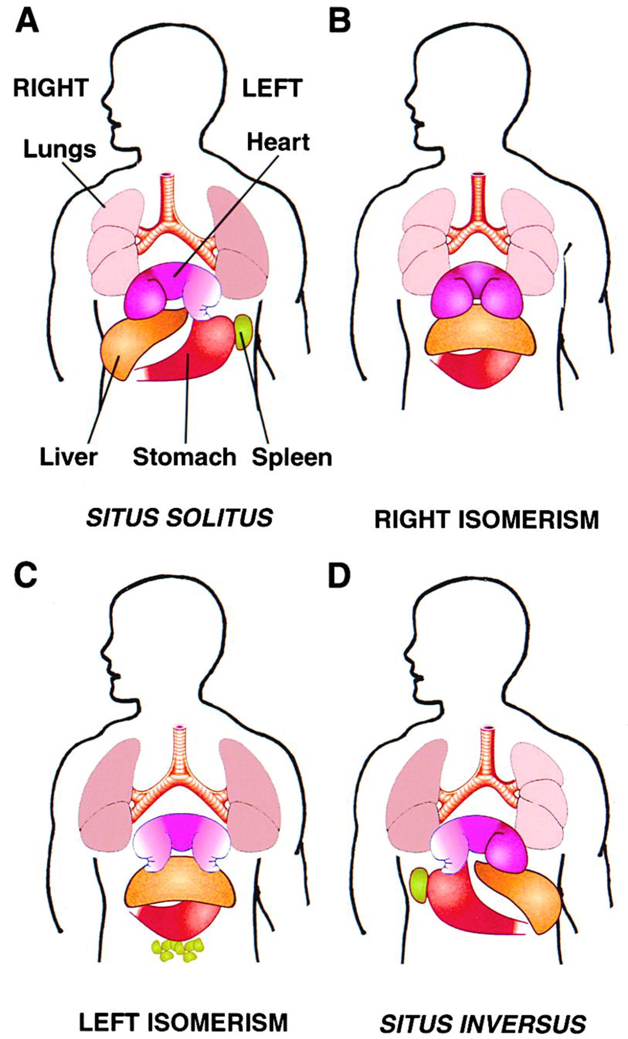 Situs inversus refers to the complete mirror-image reversal of organ asymmetry (D). Since laterality defects are highly variable, the figure depicts simplified cases, and is not intended to portray accurately the whole range of possible defects. The terms situs inversus and right or left isomerism can also be used to describe laterality defects in individual organs, even if they are not included in specific syndromes. Adapted from Brown and Anderson, 1999.