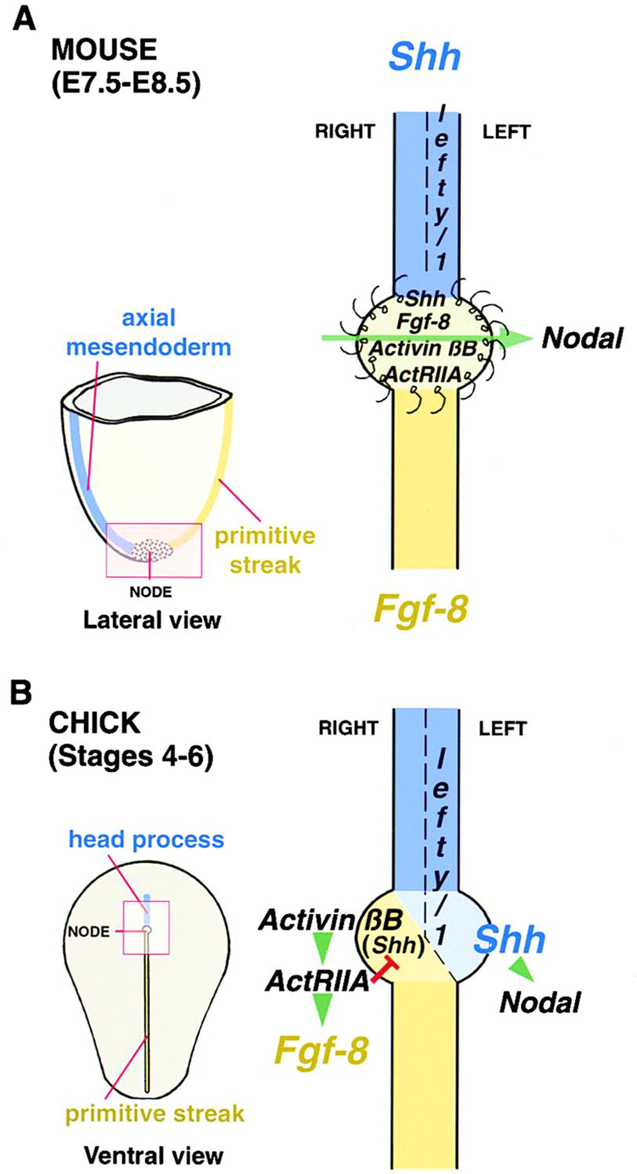 In the chick embryo (B), between stages 4 and 6, the initially symmetric expression of Shh in the node is restricted to the left side (in light blue) by an inferred Activin-like signal (possibly Activin βB), which also causes upregulation of ActRIIA on the right side (in light yellow). Shh is also expressed in the head process or nascent notochord (in dark blue). Shh acts upstream of lefty-1 expression in the left node and left side of the midline, and also acts upstream of Nodal in a domain adjacent to the left side of the node. The inferred Activin-like signal simultaneously activates Fgf-8 in the right side of the node (in light yellow); Fgf-8 is also expressed in the primitive streak (in yellow). The red squares indicate the regions of the embryos shown in detail to the right of the panels.