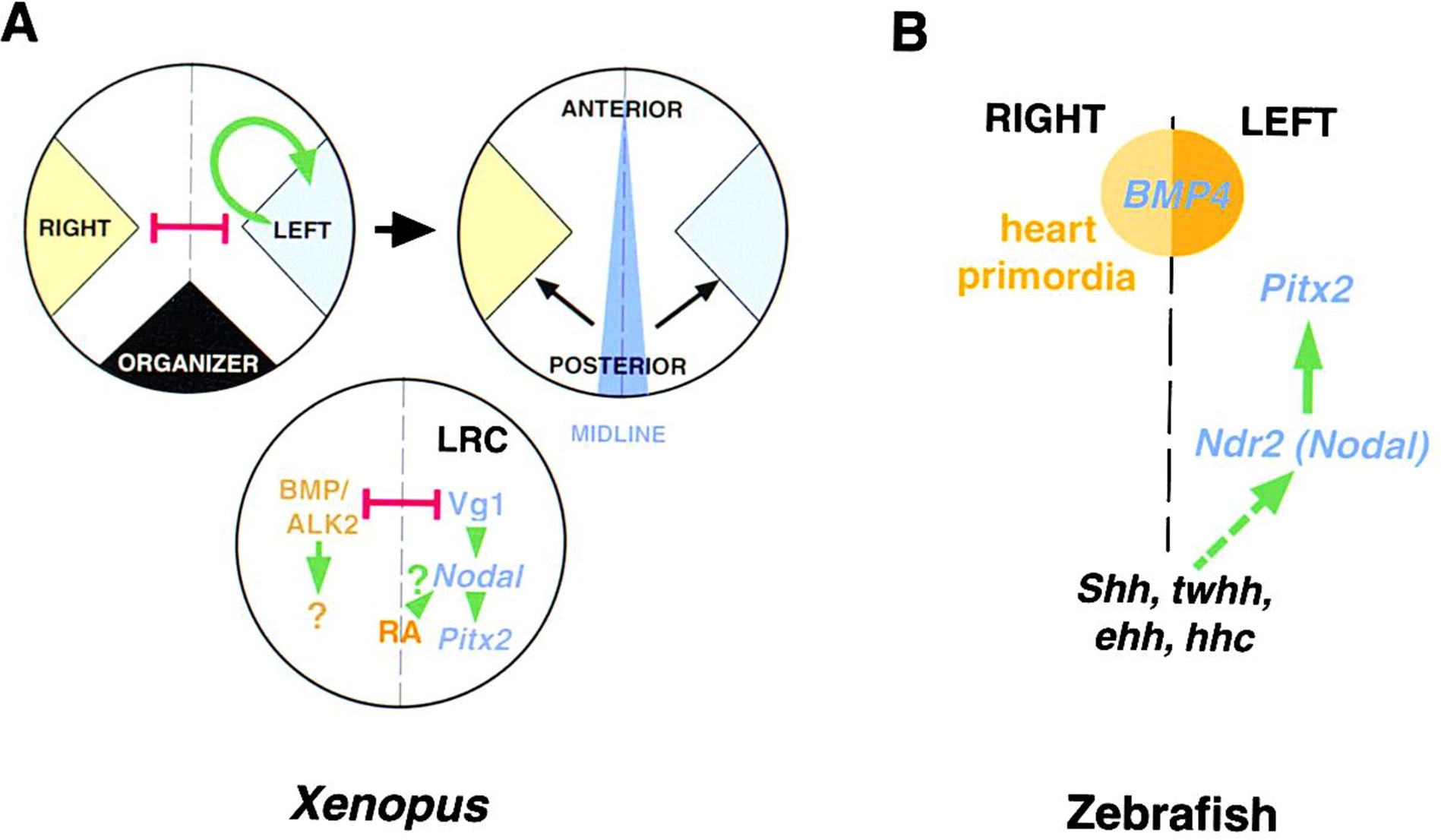 Less is known about L/R development in the zebrafish embryo (B). None of the four hedgehog (hh) genes (Shh, twhh, ehh, and hhc) has been described to be asymmetrically expressed in zebrafish, but overexpression of Shh randomizes the situs of the heart and other visceral organs, most likely through the activity of the Nodal-related gene Ndr2. BMPs are expressed asymmetrically in the heart field (in orange), and BMP misexpression only affects the heart, pointing toward a specific role for BMPs in the development of this organ in zebrafish. It remains to be seen whether some other TGF-β (or other molecule) plays the role of repressing Ndr2. In zebrafish and Xenopus, unlike in chick and mouse, asymmetry of Nodal expression around the node has not been detected ( 48, 75 and 70).